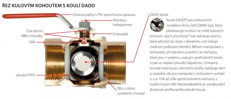 Kulový kohout a patentovanou koulí DADO s vnitřními závity (těžká řada). Pro rozvody vody, vzduchu a neagresivních kapalin a plynů.