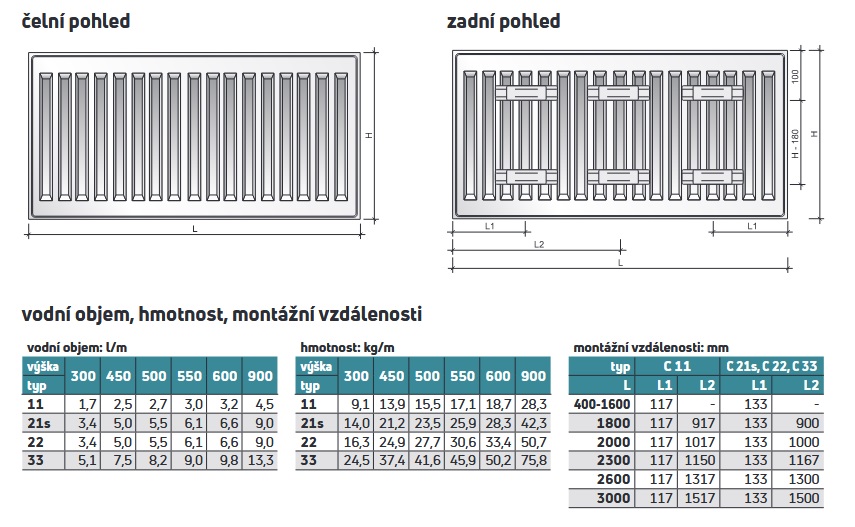 - výšky radiátorů: 300, 450, 550, 600, 900, 950 mm