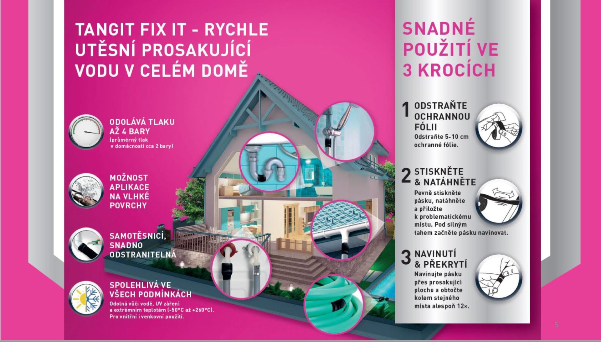 Pro opravy a utěsnění, trubek, kohoutů, hadic a potrubí v dílně, v autě, na lodi, na zahradě. Také vhodná pro izolaci elektřiny. Použitelná i na vlhké podklady. Rychlé utěsnění kapajícího potrubí a hadic v interiéru i exteriéru.
